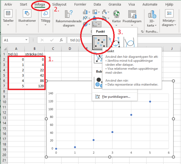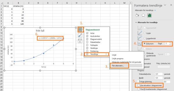 För att anpassa en trendlinje till mätpunkterna och visa kurvans ekvation: