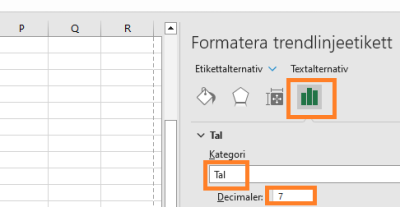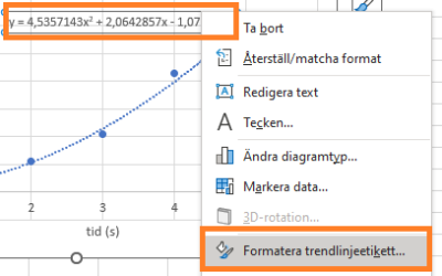 Högerklicka på ekvationen och välj formatera trendlinjeettiket, se figur nedan.