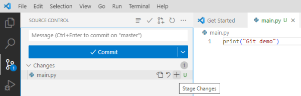 Klicka på (+) Stage changes, se figur. Görs för att spara ändringar i en eller flera filer.