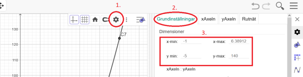 Specificera x- och y-axelns start och slut, se figur nedan. Gör i numrerad ordning: 1, 2, och 3.